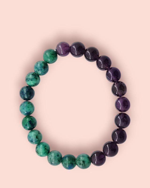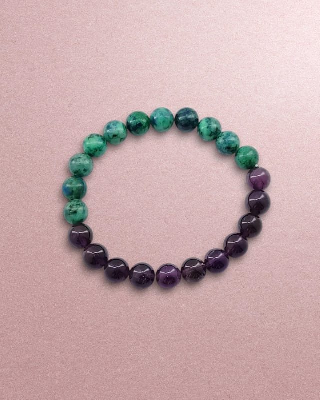 This handcrafted bracelet features Azurite and Amethyst, two powerful stones known for their ability to enhance spiritual awareness and mental clarity. Each bead is carefully selected to provide maximum healing and energetic support. The bracelet is designed with an elastic fit, ensuring comfort and flexibility for everyday wear, and is available in natural 8mm stone beads (or a custom size upon request). Ideal for meditation, energy healing, or anyone looking to deepen their intuition, this bracelet is a must-have for anyone on a spiritual journey.